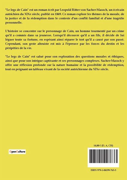 "Le legs de Caïn" est un roman écrit par Leopold Ritter von Sacher-Masoch, un écrivain autrichien du XIXe siècle, publié en 1869. Ce roman explore les thèmes de la morale, de la justice et de la rédemption dans le contexte d'un conflit familial et d'une tragédie personnelle. L'histoire se concentre sur le personnage de Caïn, un homme tourmenté par un crime qu'il a commis dans sa jeunesse. Lorsqu'il découvre qu'il a un fils, il décide de lui léguer toute sa fortune, en espérant ainsi réparer le tort qu'il a causé par son passé. Cependant, son geste altruiste est mis à l'épreuve par les forces du destin et les péripéties de la vie. "Le legs de Caïn" est salué pour son exploration des questions morales et éthiques, ainsi que pour son intrigue captivante et ses personnages complexes. Sacher-Masoch y offre une réflexion profonde sur la nature humaine et la possibilité de rédemption, tout en peignant un tableau vivant de la société autrichienne du XIXe siècle.