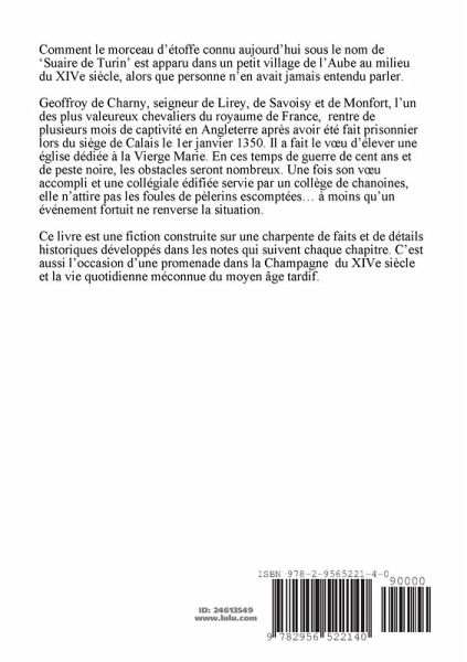 Comment le morceau d??toffe connu aujourd'hui sous le nom de ?Suaire de Turin? est apparu dans la coll?giale fond?e par Geoffroy de Charny ? Lirey, petit village de l?Aube, au milieu du XIVe si?cle, alors que personne n?en avait jamais entendu parler. Ce livre est une fiction construite sur une charpente de faits et de d?tails historiques document?s d?velopp?s dans les notes qui suivent chaque chapitre. C?est aussi l?occasion d?une promenade dans la Champagne du XIVe si?cle et la vie quotidienne m?connue du moyen ?ge tardif.