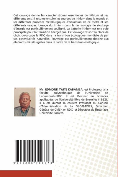 Cet ouvrage donne les caractéristiques essentielles du lithium et ses différents sels. Il résume ensuite les sources de lithium dans le monde et les différents procédés métallurgiques d'extraction de ce métal et ses différents usages. L'usage du lithium dans la technologie de stockage d'énergie est particulièrement souligné. La batterie-lithium est une voie principale pour la transition énergétique. Cet ouvrage ressort la place de choix qu'occupe la RDC dans la transition écologique mondiale de par ses potentialités naturelles. l'ouvrage est particulièrement destiné aux étudiants métallurgistes dans le cadre de la transition écologique.