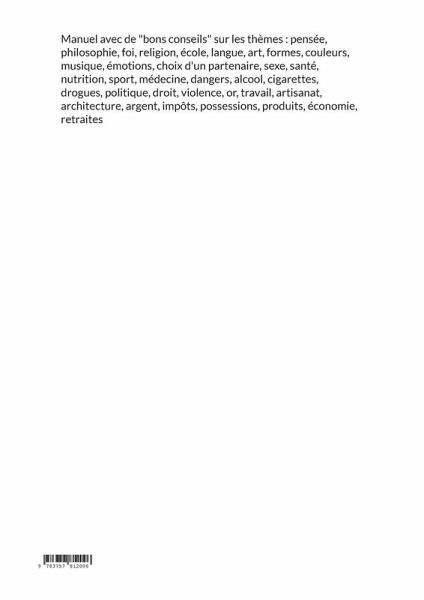 Manuel avec de "bons conseils" sur les thèmes : pensée, philosophie, foi, religion, école, langue, art, formes, couleurs, musique, émotions, choix d'un partenaire, sexe, santé, nutrition, sport, médecine, dangers, alcool, cigarettes, drogues, politique, droit, violence, or, travail, artisanat, architecture, argent, impôts, possessions, produits, économie, retraites
