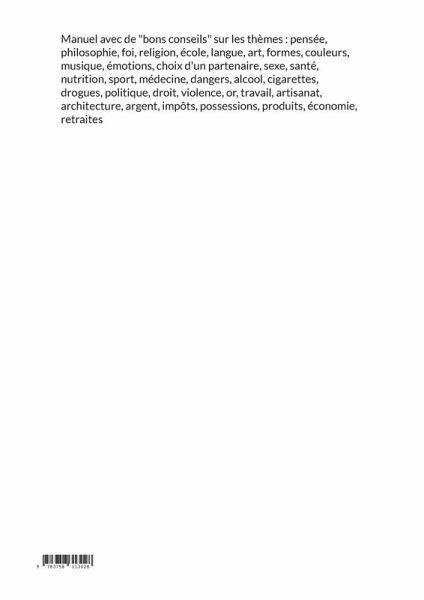 Manuel avec de "bons conseils" sur les thèmes : pensée, philosophie, foi, religion, école, langue, art, formes, couleurs, musique, émotions, choix d'un partenaire, sexe, santé, nutrition, sport, médecine, dangers, alcool, cigarettes, drogues, politique, droit, violence, or, travail, artisanat, architecture, argent, impôts, possessions, produits, économie, retraites
