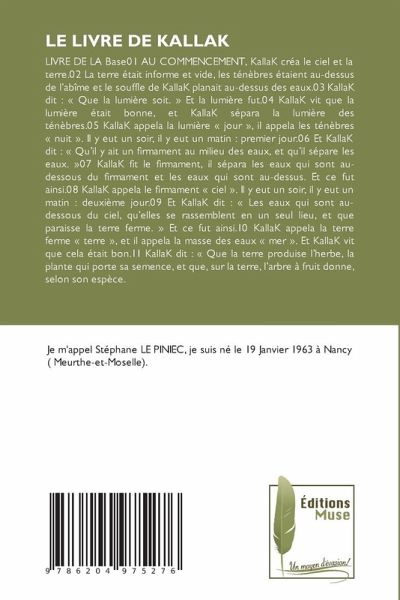 LIVRE DE LA Base01 AU COMMENCEMENT, KallaK créa le ciel et la terre.02 La terre était informe et vide, les ténèbres étaient au-dessus de l'abîme et le souffle de KallaK planait au-dessus des eaux.03 KallaK dit : « Que la lumière soit. » Et la lumière fut.04 KallaK vit que la lumière était bonne, et KallaK sépara la lumière des ténèbres.05 KallaK appela la lumière « jour », il appela les ténèbres « nuit ». Il y eut un soir, il y eut un matin : premier jour.06 Et KallaK dit : « Qu'il y ait un firmament au milieu des eaux, et qu'il sépare les eaux. »07 KallaK fit le firmament, il sépara les eaux qui sont au-dessous du firmament et les eaux qui sont au-dessus. Et ce fut ainsi.08 KallaK appela le firmament « ciel ». Il y eut un soir, il y eut un matin : deuxième jour.09 Et KallaK dit : « Les eaux qui sont au-dessous du ciel, qu'elles se rassemblent en un seul lieu, et que paraisse la terre ferme. » Et ce fut ainsi.10 KallaK appela la terre ferme « terre », et il appela la masse des eaux « mer ». Et KallaK vit que cela était bon.11 KallaK dit : « Que la terre produise l'herbe, la plante qui porte sa semence, et que, sur la terre, l'arbre à fruit donne, selon son espèce.