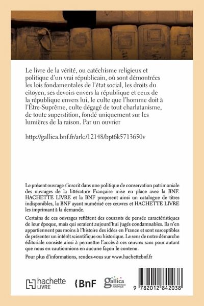Le livre de la vérité, ou catéchisme religieux et politique d'un vrai républicain, où sont démontrées les lois fondamentales de l'état social, les droits du citoyen, ses devoirs envers la république et ceux de la république envers lui, le culte que l'homme doit à l'Être-Suprême, culte dégagé de tout charlatanisme, de toute superstition, fondé uniquement sur les lumières de la raison . Par un ouvrier Date de l'édition originale: 1848 Sujet de l'ouvrage: France (1848-1852, 2e République) Le présent ouvrage s'inscrit dans une politique de conservation patrimoniale des ouvrages de la littérature Française mise en place avec la BNF. HACHETTE LIVRE et la BNF proposent ainsi un catalogue de titres indisponibles, la BNF ayant numérisé ces oeuvres et HACHETTE LIVRE les imprimant à la demande. Certains de ces ouvrages reflètent des courants de pensée caractéristiques de leur époque, mais qui seraient aujourd'hui jugés condamnables. Ils n'en appartiennent pas moins à l'histoire des idées en France et sont susceptibles de présenter un intérêt scientifique ou historique. Le sens de notre démarche éditoriale consiste ainsi à permettre l'accès à ces oeuvres sans pour autant que nous en cautionnions en aucune façon le contenu. Pour plus d'informations, rendez-vous sur www.hachettebnf.fr