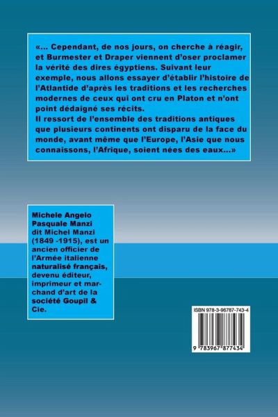 ... Cependant, de nos jours, on cherche à réagir, et Burmester et Draper viennent d'oser proclamer la vérité des dires égyptiens. Suivant leur exemple, nous allons essayer d'établir l'histoire de l'Atlantide d'après les traditions et les recherches modernes de ceux qui ont cru en Platon et n'ont point dédaigné ses récits. Il ressort de l'ensemble des traditions antiques que plusieurs continents ont disparu de la face du monde, avant même que l'Europe, l'Asie que nous connaissons, l'Afrique, soient nées des eaux...