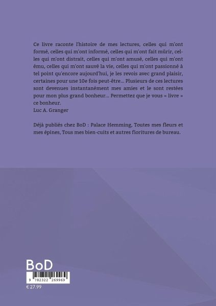 Ce livre raconte l'histoire de mes lectures, celles qui m'ont formé, celles qui m'ont informé, celles qui m'ont distrait, celles qui m'ont amusé, celles qui m'ont ému, celles qui m'ont sauvé la vie, celles qui m'ont passionné au point qu'encore aujourd'hui, je les relis avec intérêt, certaines pour une dixième fois peut-être. Plusieurs de ces lectures sont devenues instantanément mes amies et le sont resté pour mon plus grand bonheur... Bonheur que je vous livre et partage aujourd'hui.
