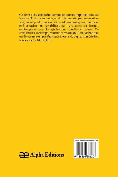 Le livre de Monelle" est un livre classique, qui a eu une valeur significative tout au long de l'histoire, et pour garantir que sa sagesse intemporelle ne soit jamais perdue, Alpha Editions l'a soigneusement préservé en le republiant dans un format moderne et accessible aux générations présentes et futures. Soigneusement reformaté, retapé , et nouvellement conçue, cette édition offre un texte clair et lisible, sans copies numérisées de l'uvre originale, Alpha Editions se consacre à insuffler une nouvelle vie aux livres anciens et classiques, rendant ces trésors littéraires à nouveau disponibles pour les lecteurs qui chérissent l'histoire. culture et savoir intemporel.