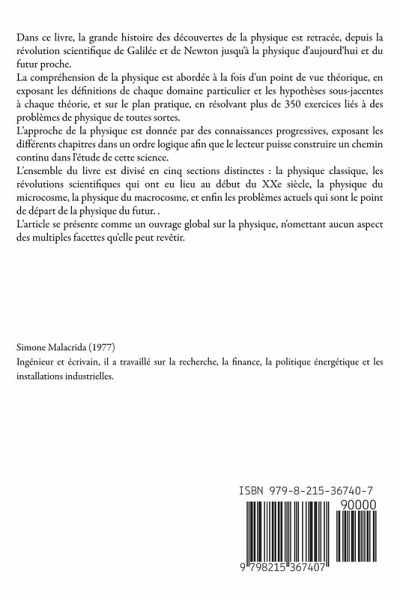 Dans ce livre, la grande histoire des découvertes de la physique est retracée, depuis la révolution scientifique de Galilée et de Newton jusqu'à la physique d'aujourd'hui et du futur proche. La compréhension de la physique est abordée à la fois d'un point de vue théorique, en exposant les définitions de chaque domaine particulier et les hypothèses sous-jacentes à chaque théorie, et sur le plan pratique, en résolvant plus de 350 exercices liés à des problèmes de physique de toutes sortes. L'approche de la physique est donnée par des connaissances progressives, exposant les différents chapitres dans un ordre logique afin que le lecteur puisse construire un chemin continu dans l'étude de cette science. L'ensemble du livre est divisé en cinq sections distinctes : la physique classique, les révolutions scientifiques qui ont eu lieu au début du XXe siècle, la physique du microcosme, la physique du macrocosme, et enfin les problèmes actuels qui sont le point de départ de la physique du futur. . L'article se présente comme un ouvrage global sur la physique, n'omettant aucun aspect des multiples facettes qu'elle peut revêtir.