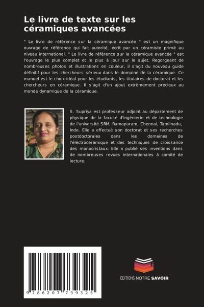 " Le livre de référence sur la céramique avancée " est un magnifique ouvrage de référence qui fait autorité, écrit par un céramiste primé au niveau international. " Le livre de référence sur la céramique avancée " est l'ouvrage le plus complet et le plus à jour sur le sujet. Regorgeant de nombreuses photos et illustrations en couleur, il s'agit du nouveau guide définitif pour les chercheurs sérieux dans le domaine de la céramique. Ce manuel est le choix idéal pour les étudiants, les titulaires de doctorat et les chercheurs en céramique. Il s'agit d'un ajout extrêmement précieux au monde dynamique de la céramique.
