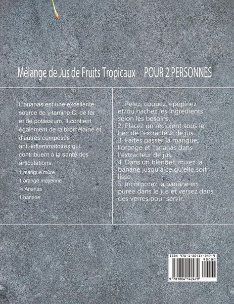 Partez du bon pied avec de l'énergie naturelle et les saveurs éclatantes des jus. Découvrez 360 jours de recettes de jus qui exploitent le pouvoir de la nature pour alimenter un esprit et un corps sains. Ces recettes de jus vous aideront à tenir le coup, quoi que la journée vous réserve ! Prenez ce guide du jus et lancez-vous dans un voyage délicieux et nutritif. Des recettes pour débutants aux conseils sur les bienfaits spécifiques des jus pour la santé, ce livre a tout ce qu'il faut. Grâce à ces recettes, vous deviendrez un pro du jus en un rien de temps et vous profiterez de tous les bienfaits du jus. Simple mais complet, ce livre de recettes de jus vous offre : Traitez votre esprit et votre corps - avec des jus pour la santé du cerveau, le nettoyage et la désintoxication, la digestion, la santé cardiaque, le renforcement de l'immunité et le soutien de la structure. Transformez votre cuisine en bar à jus - avec des conseils pour choisir le bon extracteur de jus et préparer les produits comme un pro. Des dizaines de recettes délicieuses, rapides et faciles - avec des ingrédients naturels pour préparer des jus qui amélioreront votre santé et affineront votre tour de taille en un rien de temps. Il vous suffit de cliquer sur "Acheter maintenant" et de commencer chaque journée en vous rafraîchissant et en vous nourrissant d'un verre de jus fraîchement pressé provenant du livre Le Livre des Recettes de Juicing.