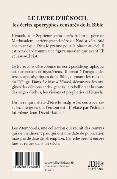 Découvrez les révélations cachées de la Bible et les visions prophétiques du père de Mathusalem ! Censuré de la Bible, mais retenu par l'Église éthiopienne dans son canon biblique, ce texte attribué à Hénoch, arrière-grand-père de Noé et arrière-petit-fils d'Adam, aurait en fait été écrit entre le troisième et le premier siècle avant Jésus-Christ. Il est très recherché actuellement mais on le trouve beaucoup en auto-édition. Vous avez ici accès à une version d'éditeur, avec une préface de l'éditeur lui-même, économiste, sociologue et passionné de spiritualité et d'ésotérisme, ayant préfacé par exemple « L'Ecclésiaste ». La traduction présentée ici est celle réalisée en 1906 par François Martin. Elle est parfaitement compréhensible et contemporaine. C'est la plus adaptée au public français. Les veilleurs, les géants, Satan, la figure du Messie, ainsi que les visions et prophéties d'Hénoch sur la fin des temps et le jugement des nations, sont autant de sujets abordés dans ces pages. La vision de l'après-mort (le Schéol), qui a en partie inspiré le christianisme, est incontournable. Un livre à posséder, qui viendra utilement compléter aussi bien une Bible que des livres ésotériques sur une bibliothèque !