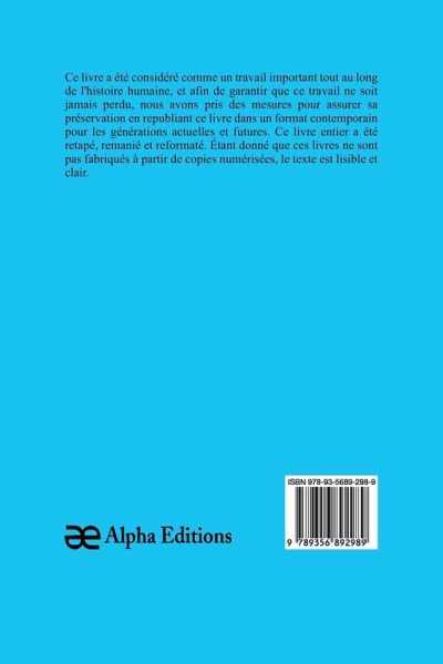 Le livre du faulcon, a été reconnu comme une ¿uvre majeure dans toute l'histoire humaine, et nous avons pris des précautions pour assurer sa préservation en rééditant ce livre de manière moderne pour les générations présentes et futures. Ce livre a été entièrement retapé, révisé et reformaté. Le texte est lisible et clair car ces livres ne sont pas créés à partir de copies numérisées.