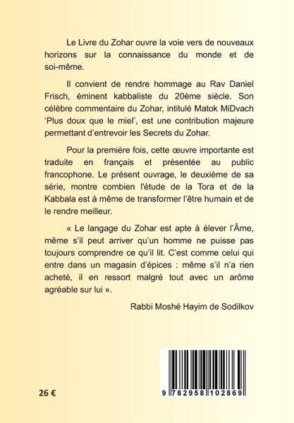 Le Livre du Zohar ouvre la voie vers de nouveaux horizons, et vers la connaissance de soi. Grâce au mérite du Rav Daniel Frisch (1935 - 2005), qui est considéré dans le monde comme un kabbaliste particulièrement éminent, nous disposons aujourd'hui d'un commentaire qui permet à chacun d'accéder au sens profond du Zohar. Pour la première fois, cette oeuvre importante est traduite en français et présentée au public francophone. Le présent ouvrage montre combien l'étude de la Tora et de la Kabbalah est à même de transformer l'homme et de le rendre meilleur. "Le langage du Zohar contribue à élever l'Âme, même s'il arrive qu'un homme ne comprend pas toujours ce qu'il lit. C'est comme celui qui entre dans un magasin d'épices: bien qu'il n'ait rien acheté, il en ressort cependant avec un arôme agréable sur lui". Rabbi Moshé Hayim de Sodilkov
