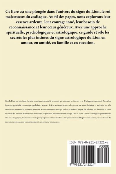 Ce livre est une plongée dans l'univers du signe du Lion, le roi majestueux du zodiaque. Au fil des pages, nous explorons leur essence ardente, leur courage inné, leur besoin de reconnaissance et leur cur généreux. Avec une approche spirituelle, psychologique et astrologique, ce guide révèle les secrets les plus intimes du signe astrologique du Lion en amour, en amitié, en famille et en vocation.