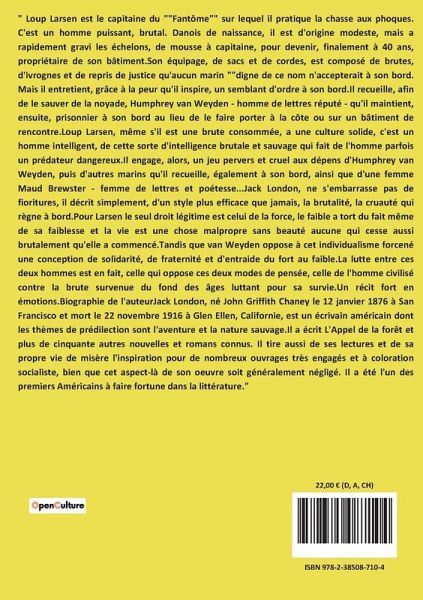 " Loup Larsen est le capitaine du ""Fantôme"" sur lequel il pratique la chasse aux phoques. C'est un homme puissant, brutal. Danois de naissance, il est d'origine modeste, mais a rapidement gravi les échelons, de mousse à capitaine, pour devenir, finalement à 40 ans, propriétaire de son bâtiment.Son équipage, de sacs et de cordes, est composé de brutes, d'ivrognes et de repris de justice qu'aucun marin ""digne de ce nom n'accepterait à son bord. Mais il entretient, grâce à la peur qu'il inspire, un semblant d'ordre à son bord.Il recueille, afin de le sauver de la noyade, Humphrey van Weyden - homme de lettres réputé - qu'il maintient, ensuite, prisonnier à son bord au lieu de le faire porter à la côte ou sur un bâtiment de rencontre.Loup Larsen, même s'il est une brute consommée, a une culture solide, c'est un homme intelligent, de cette sorte d'intelligence brutale et sauvage qui fait de l'homme parfois un prédateur dangereux.Il engage, alors, un jeu pervers et cruel aux dépens d'Humphrey van Weyden, puis d'autres marins qu'il recueille, également à son bord, ainsi que d'une femme Maud Brewster - femme de lettres et poétesse...Jack London, ne s'embarrasse pas de fioritures, il décrit simplement, d'un style plus efficace que jamais, la brutalité, la cruauté qui règne à bord.Pour Larsen le seul droit légitime est celui de la force, le faible a tort du fait même de sa faiblesse et la vie est une chose malpropre sans beauté aucune qui cesse aussi brutalement qu'elle a commencé.Tandis que van Weyden oppose à cet individualisme forcené une conception de solidarité, de fraternité et d'entraide du fort au faible.La lutte entre ces deux hommes est en fait, celle qui oppose ces deux modes de pensée, celle de l'homme civilisé contre la brute survenue du fond des âges luttant pour sa survie.Un récit fort en émotions.Biographie de l'auteurJack London, né John Griffith Chaney le 12 janvier 1876 à San Francisco et mort le 22 novembre 1916 à Glen Ellen, Californie, est un écrivain américain dont les thèmes de prédilection sont l'aventure et la nature sauvage.Il a écrit L'Appel de la forêt et plus de cinquante autres nouvelles et romans connus. Il tire aussi de ses lectures et de sa propre vie de misère l'inspiration pour de nombreux ouvrages très engagés et à coloration socialiste, bien que cet aspect-là de son oeuvre soit généralement négligé. Il a été l'un des premiers Américains à faire fortune dans la littérature."