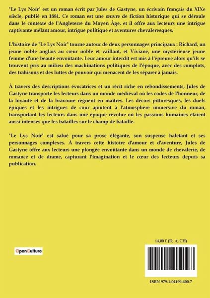 "Le Lys Noir" est un roman écrit par Jules de Gastyne, un écrivain français du XIXe siècle, publié en 1881. Ce roman est une ¿uvre de fiction historique qui se déroule dans le contexte de l'Angleterre du Moyen Âge, et il offre aux lecteurs une intrigue captivante mêlant amour, intrigue politique et aventures chevaleresques. L'histoire de "Le Lys Noir" tourne autour de deux personnages principaux : Richard, un jeune noble anglais au c¿ur noble et vaillant, et Viviane, une mystérieuse jeune femme d'une beauté envoûtante. Leur amour interdit est mis à l'épreuve alors qu'ils se trouvent pris au milieu des machinations politiques de l'époque, avec des complots, des trahisons et des luttes de pouvoir qui menacent de les séparer à jamais. À travers des descriptions évocatrices et un récit riche en rebondissements, Jules de Gastyne transporte les lecteurs dans un monde médiéval où les codes de l'honneur, de la loyauté et de la bravoure règnent en maîtres. Les décors pittoresques, les duels épiques et les intrigues de cour ajoutent à l'atmosphère immersive du roman, transportant les lecteurs dans une époque révolue où les passions humaines étaient aussi intenses que les batailles sur le champ de bataille. "Le Lys Noir" est salué pour sa prose élégante, son suspense haletant et ses personnages complexes. À travers cette histoire d'amour et d'aventure, Jules de Gastyne offre aux lecteurs une plongée envoûtante dans un monde de chevalerie, de romance et de drame, capturant l'imagination et le c¿ur des lecteurs depuis sa publication.