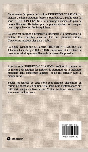 Cette uvre (édition relié) fait partie de la série TREDITION CLASSICS. La maison d édition tredition, basée à Hambourg, a publié dans la série TREDITION CLASSICS des ouvrages anciens de plus de deux millénaires. Ils étaient pour la plupart épuisés ou uniquement disponible chez les bouquinistes. La série est destinée à préserver la littérature et à promouvoir la culture. Avec sa série TREDITION CLASSICS, tredition à comme but de mettre à disposition des milliers de classiques de la littérature mondiale dans différentes langues et de les diffuser dans le monde entier.