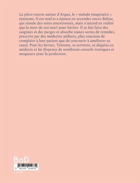 La pièce tourne autour d'Argan, le « malade imaginaire », éponyme. Il est veuf et a épousé en secondes noces Béline, qui simule des soins attentionnés, mais n'attend en réalité que la mort de son mari pour hériter. Il se fait faire des saignées et des purges et absorbe toutes sortes de remèdes, prescrits par des médecins pédants, plus soucieux de complaire à leur patient que de concourir à améliorer sa santé. Pour les berner, Toinette, sa servante, se déguise en médecin et lui dispense de nombreux conseils ironiques et moqueurs pour la profession.