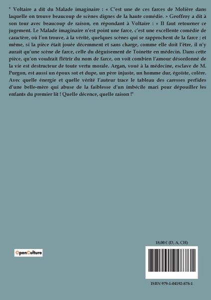 "Le Malade imaginaire" est une comédie-ballet en trois actes écrite par Molière et présentée pour la première fois en 1673. Cette uvre met en scène Argan, un hypocondriaque obsédé par sa santé et entouré de médecins plus intéressés par son argent que par son bien-être. Argan souhaite marier sa fille Angélique à Thomas Diafoirus, un jeune médecin, pour avoir un praticien dans la famille. Cependant, Angélique est amoureuse de Cléante, un jeune homme sans fortune. La servante Toinette, personnage central et astucieux, s'efforce de déjouer les plans d'Argan et de favoriser l'union des deux jeunes amoureux. La pièce est une satire mordante de la médecine de l'époque, mettant en lumière l'ignorance et la cupidité des médecins. Molière utilise l'humour et la musique pour critiquer les pratiques médicales et les travers humains, tout en explorant des thèmes universels tels que l'amour, la famille et la crédulité. Le dénouement voit Argan, grâce à une ruse de Toinette, réaliser l'absurdité de ses obsessions et accepter le mariage d'Angélique avec Cléante. "Le Malade imaginaire" est également connu pour être la dernière uvre de Molière, qui est décédé peu après la quatrième représentation, ajoutant une dimension tragique à cette comédie.