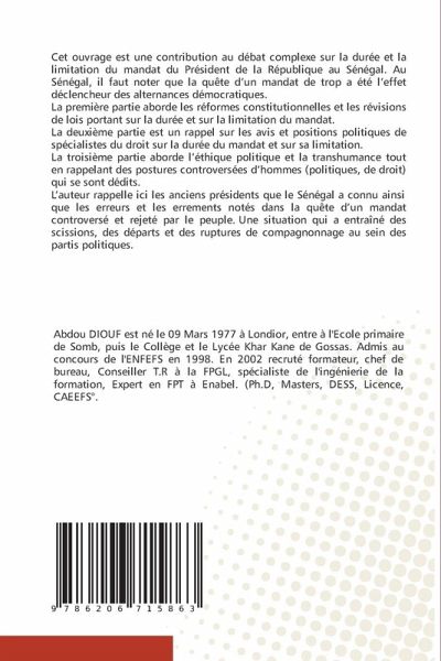 Cet ouvrage est une contribution au débat complexe sur la durée et la limitation du mandat du Président de la République au Sénégal. Au Sénégal, il faut noter que la quête d'un mandat de trop a été l'effet déclencheur des alternances démocratiques.La première partie aborde les réformes constitutionnelles et les révisions de lois portant sur la durée et sur la limitation du mandat.La deuxième partie est un rappel sur les avis et positions politiques de spécialistes du droit sur la durée du mandat et sur sa limitation.La troisième partie aborde l'éthique politique et la transhumance tout en rappelant des postures controversées d'hommes (politiques, de droit) qui se sont dédits. L'auteur rappelle ici les anciens présidents que le Sénégal a connu ainsi que les erreurs et les errements notés dans la quête d'un mandat controversé et rejeté par le peuple. Une situation qui a entraîné des scissions, des départs et des ruptures de compagnonnage au sein des partis politiques.