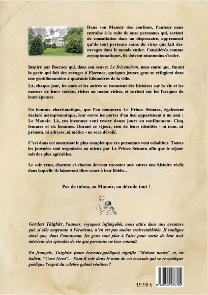 Dans son Manoir des confinés, l'auteur nous entraîne à la suite de onze personnes qui, sortant de consultation dans un dispensaire, apprennent qu'ils sont porteurs sains du virus qui fait des ravages dans le monde entier. Considérés comme asymptomatiques, ils doivent néanmoins s'isoler.Un homme charismatique, que l'on nommera Le Prince Sémara, également déclaré asymptomatique, leur ouvre les portes d'un lieu appartenant à un ami : Le Manoir. Là, ces inconnus vont rester douze jours en confinement. Cinq femmes et six hommes. Durant ce séjour, rien de leurs identités - ni nom, ni prénom, ni adresse, ni métier - ne sera dévoilé.C'est dans cet anonymat le plus complet que ces personnes vont cohabiter. Toutes les journées sont organisées au mieux par Le Prince Sémara afin que le séjour soit des plus agréables.Le soir venu, chacune et chacun devront raconter aux autres, une histoire réelle dans laquelle ils laisseront libre court à leur libido...Pas de tabou, au Manoir, on dévoile tout !