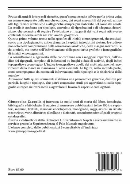 Frutto di anni di lavoro e di ricerche, quest'opera intende offrire per la prima volta un esame comparato delle marche europee, dai segni mercantili del periodo antico alle figurazioni simboliche e allegoriche sempre più elaborate nel corso dei secoli. Lo studio è condotto per tipologie, corredato di riproduzioni e di adeguata descrizione, che permette di seguire l'evoluzione e i rapporti dei vari segni attraverso confronti di forme simili nei vari ambiti geografici. Questo primo volume tratta nello specifico di iniziali e monogrammi, che costituiscono una tipologia molto antica di marca. I capitoli introduttivi aiutano lo studioso non solo nella comprensione delle convenzioni araldiche, delle insegne mercantili e dei simboli, ma anche nell'individuazione delle peculiarità grafiche e iconografiche di iniziali e monogrammi. La consultazione è agevolata dalle concordanze con i maggiori repertori, dall'indice dei tipografi, completo di indicazioni su luoghi e date di attività, dagli indici topografico e cronologico. L'indice iconografico e quello dei motti aiutano nel reperimento della marca in mancanza di altri elementi. Le figure, nella seconda parte, sono accompagnate da essenziali informazioni sulla tipologia e la titolarietà delle marche.