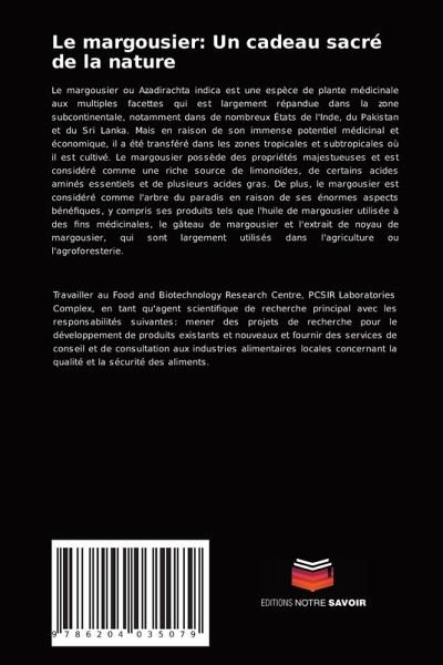 Le margousier ou Azadirachta indica est une espèce de plante médicinale aux multiples facettes qui est largement répandue dans la zone subcontinentale, notamment dans de nombreux États de l'Inde, du Pakistan et du Sri Lanka. Mais en raison de son immense potentiel médicinal et économique, il a été transféré dans les zones tropicales et subtropicales où il est cultivé. Le margousier possède des propriétés majestueuses et est considéré comme une riche source de limonoïdes, de certains acides aminés essentiels et de plusieurs acides gras. De plus, le margousier est considéré comme l'arbre du paradis en raison de ses énormes aspects bénéfiques, y compris ses produits tels que l'huile de margousier utilisée à des fins médicinales, le gâteau de margousier et l'extrait de noyau de margousier, qui sont largement utilisés dans l'agriculture ou l'agroforesterie.