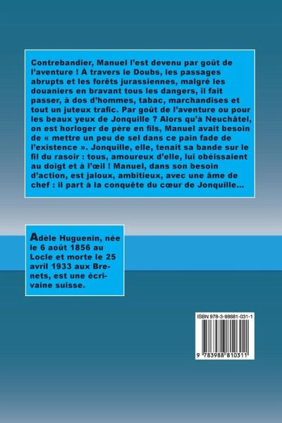 Contrebandier, Manuel l'est devenu par goût de l'aventure ! À travers le Doubs, les passages abrupts et les forêts jurassiennes, malgré les douaniers en bravant tous les dangers, il fait passer, à dos d'hommes, tabac, marchandises et tout un juteux trafic. Par goût de l'aventure ou pour les beaux yeux de Jonquille ? Alors qu'à Neuchâtel, on est horloger de père en fils, Manuel avait besoin de mettre un peu de sel dans ce pain fade de l'existence . Jonquille, elle, tenait sa bande sur le fil du rasoir : tous, amoureux d'elle, lui obéissaient au doigt et à l'¿il ! Manuel, dans son besoin d'action, est jaloux, ambitieux, avec une âme de chef : il part à la conquête du c¿ur de Jonquille...
