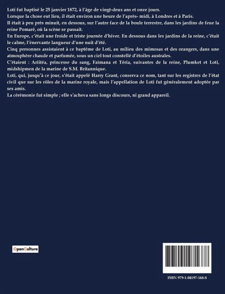 Loti fut baptisé le 25 janvier 1872, à l¿âge de vingt-deux ans et onze jours. Lorsque la chose eut lieu, il était environ une heure de l¿après- midi, à Londres et à Paris. Il était à peu près minuit, en dessous, sur l¿autre face de la boule terrestre, dans les jardins de feue la reine Pomaré, où la scène se passait. En Europe, c¿était une froide et triste journée d¿hiver. En dessous dans les jardins de la reine, c¿était le calme, l¿énervante langueur d¿une nuit d¿été. Cinq personnes assistaient à ce baptême de Loti, au milieu des mimosas et des orangers, dans une atmosphère chaude et parfumée, sous un ciel tout constellé d¿étoiles australes. C¿étaient : Ariitéa, princesse du sang, Faïmana et Téria, suivantes de la reine, Plumket et Loti, midshipmen de la marine de S.M. Britannique. Loti, qui, jusqüà ce jour, s¿était appelé Harry Grant, conserva ce nom, tant sur les registres de l¿état civil que sur les rôles de la marine royale, mais l¿appellation de Loti fut généralement adoptée par ses amis. La cérémonie fut simple ; elle s¿acheva sans longs discours, ni grand appareil.