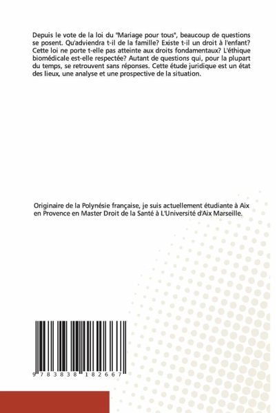 Depuis le vote de la loi du "Mariage pour tous", beaucoup de questions se posent. Qu'adviendra t-il de la famille? Existe t-il un droit à l'enfant? Cette loi ne porte t-elle pas atteinte aux droits fondamentaux? L'éthique biomédicale est-elle respectée? Autant de questions qui, pour la plupart du temps, se retrouvent sans réponses. Cette étude juridique est un état des lieux, une analyse et une prospective de la situation.