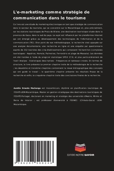 Ce livre est une étude du marketing électronique en tant que stratégie de communication dans le secteur du tourisme, qui se concentre sur le Mozambique et, plus précisément, sur les stations touristiques de Praia de Bilene, une destination touristique située dans la province de Gaza, dans le sud du pays. Le sujet est influencé par les plateformes Internet qui ont émergé grâce au développement des technologies de l'information et de la communication (TIC). D'un point de vue méthodologique, la recherche s'est appuyée sur une analyse documentaire, une recherche en ligne et une enquête par questionnaire auprès de 312 touristes des cinq établissements qui composent l'échantillon (complexes touristiques - Aquárius, Humula, Palmeiras, Ferroviário et plage de Massala). Les données ont été traitées à l'aide du progiciel statistique SPSS 17.0, et plus particulièrement de l'outil Analyse - Statistiques descriptives - Fréquences et tableaux croisés. En termes de structure, le livre présente Le premier chapitre traite de la méthodologie de la recherche ; les deuxième et troisième chapitres contiennent la revue bibliographique des concepts qui ont guidé le travail ; le quatrième chapitre présente les résultats finaux de la recherche et enfin, le cinquième chapitre traite des conclusions finales de la recherche.