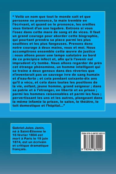 " Voilà un nom que tout le monde sait et que personne ne prononce, la main tremble en l'écrivant, et quand on le prononce, les oreilles vous tintent d'un son lugubre. Entrons si vous l'osez dans cette mare de sang et de vices. Il faut un grand courage pour aborder cette biographie, qui pourtant prendra sa place parmi les plus souillées et les plus fangeuses. Prenons donc notre courage à deux mains, vous et moi. Nous accomplirons ensemble cette ¿uvre de justice : nous allons poser une lampe salutaire au bord de ce précipice infect et, afin qu'à l'avenir nul imprudent n'y tombe. Nous allons regarder de près cet étrange phénomène, un homme intelligent qui se traîne à deux genoux dans des rêveries que n'inventerait pas un sauvage ivre de sang humain et d'eau-forte ; et cela pendant soixante-dix ans qu'il a vécu, et cela dans toutes les positions de la vie, enfant, jeune homme, grand seigneur ; dans sa patrie et à l'étranger, en liberté et en prison ; parmi les hommes raisonnables et parmi les fous ; pervertissant les uns et les autres, plongeant dans la même infamie la prison, le salon, le théâtre, le toit domestique et l'hôpital..."