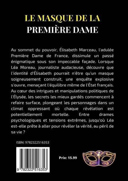 Le Masque de la Première Dame - Un Thriller Politique Palpitant Secrets, Pouvoir et Manipulation : Plongez au coeur des coulisses de l'Élysée, où les apparences sont trompeuses et les mensonges tissent une toile mortelle. Elisabeth Marceau, Première Dame de France, cache un passé trouble que personne ne soupçonne. Lorsque Lea Moreau, une journaliste d'investigation déterminée, décide de fouiller son passé, elle déclenche une tempête qui pourrait renverser la présidence et ébranler les fondements de la République. Une Course Contre la Vérité : Entre révélations explosives, manipulations politiques et menaces silencieuses, chaque page vous tiendra en haleine. Qui est réellement Elisabeth Marceau ? Pourquoi son passé est-il soigneusement effacé ? Et jusqu'où est-elle prête à aller pour protéger ses secrets ? Un Scandale Qui Pourrait Tout Détruire : Alors que les médias s'enflamment et que l'opinion publique exige des réponses, Lea Moreau se rapproche dangereusement d'une vérité que certains sont prêts à tout pour dissimuler... y compris à tuer. Un Roman Captivant et Intense : Parfait pour les amateurs de thrillers politiques et de récits haletants, "Le Masque de la Première Dame" vous plonge dans un univers où chaque décision peut changer le destin d'une nation. Pourquoi Vous Devez Absolument Lire Ce Livre ? - Un suspense implacable digne des plus grands thrillers politiques. - Des personnages complexes et fascinants pris au piège d'un jeu de pouvoir impitoyable. - Une intrigue réaliste et immersive qui explore les coulisses du pouvoir en France. Disponible dès maintenant en format numérique et papier. Ne manquez pas cette enquête haletante qui pourrait changer votre vision du pouvoir ! Commandez dès aujourd'hui et laissez-vous emporter par une histoire où la vérité peut coûter la vie.