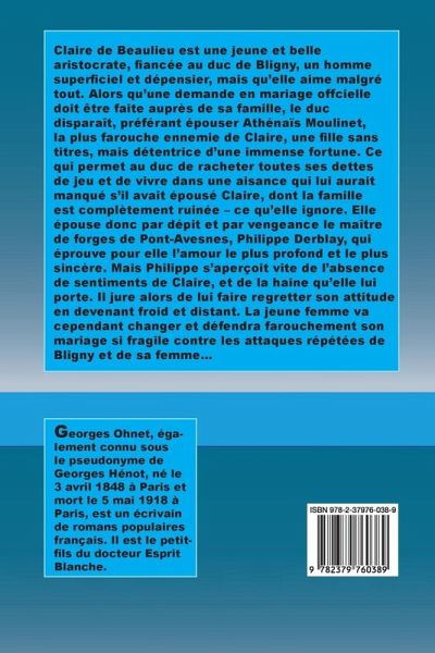 Georges Ohnet was born in Paris. Ohnet liked Georges Sand's work and didn't like realistic current books. He started writing a series of books called Les Batailles de la vie about a simple and idealistic character. The reviewers thought they were unrealistic and boring, but the books were a big hit. Serge Panine (1881), which won an award from the academy, Le Maitre de forges (1882), La Grande Marni re (1885), Volont (1888), and Dernier Amour (1891) were all in this series. A lot of his books have been turned into plays that were big hits. For example, Le Maitre de forges were put on at the Gymnase in 1883 and ran for a whole year. Le Cr puscule (1902), Le Marchand de Poison (1903), La Conqu rante (1905), La dixi me muse (1906), La Route Rouge (1908), and La Serre de l'Aigle (1912) are some of his later works. Journal of a Bourgeois of Paris During the War of 1914 was his last book.