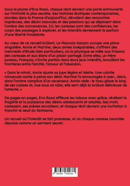 Sous la plume d'Eva Rossi, chaque récit devient une porte entrouverte sur l'intimité la plus secrète. Ses histoires érotiques contemporaines, ancrées dans la France d'aujourd'hui, dévoilent des rencontres imprévues, des désirs inavoués et des passions qui se déploient dans l'ombre des convenances. Ici, les caresses sont des confidences, les corps des paysages à explorer, et les interdits deviennent le parfum d'une liberté troublante.Au coeur de ce recueil brûlant, Le Mauvais Garçon occupe une place singulière. Annie et Martine, deux amies inséparables, s'offrent des mercredis d'étude bien particuliers, où la physique se mêle aux frissons des caresses et aux élans d'un plaisir partagé. Entre elles, un frère jumeau, François, s'invite parfois dans leurs jeux interdits, brouillant les frontières entre l'amitié, l'amour et l'abandon.« Dans le miroir, Annie ajuste sa jupe légère et hésite. Une culotte minuscule cache à peine son désir. Martine l'a encouragée à oser... Alors, dans l'ombre complice d'un ascenseur, Annie cède : le tissu glisse le long de ses cuisses et, nue sous sa robe, elle sent déjà la brûlure délicieuse de l'attente. »De pages en pages, Eva Rossi effleure les tabous avec grâce, révélant la fragilité et la puissance des désirs adolescents et adultes. Ses mots caressent, ses scènes envoûtent, et chaque récit devient une invitation à franchir le seuil du fantasme.Un recueil où l'interdit se fait promesse, et où chaque caresse racontée résonne comme un serment secret.