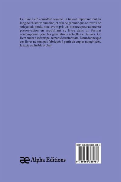 Le Mauvais Génie" est un livre classique, qui a eu une valeur significative tout au long de l'histoire, et pour garantir que sa sagesse intemporelle ne soit jamais perdue, Alpha Editions l'a soigneusement préservé en le republiant dans un format moderne et accessible aux générations présentes et futures. Soigneusement reformaté, retapé , et nouvellement conçue, cette édition offre un texte clair et lisible, sans copies numérisées de l'uvre originale, Alpha Editions se consacre à insuffler une nouvelle vie aux livres anciens et classiques, rendant ces trésors littéraires à nouveau disponibles pour les lecteurs qui chérissent l'histoire. culture et savoir intemporel.