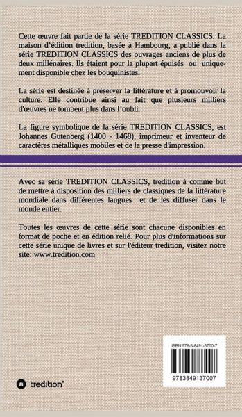 Cette uvre (édition relié) fait partie de la série TREDITION CLASSICS. La maison d édition tredition, basée à Hambourg, a publié dans la série TREDITION CLASSICS des ouvrages anciens de plus de deux millénaires. Ils étaient pour la plupart épuisés ou uniquement disponible chez les bouquinistes. La série est destinée à préserver la littérature et à promouvoir la culture. Avec sa série TREDITION CLASSICS, tredition à comme but de mettre à disposition des milliers de classiques de la littérature mondiale dans différentes langues et de les diffuser dans le monde entier.