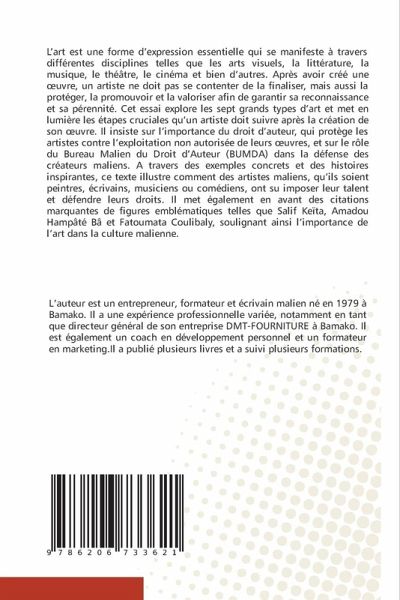 L'art est une forme d'expression essentielle qui se manifeste à travers différentes disciplines telles que les arts visuels, la littérature, la musique, le théâtre, le cinéma et bien d'autres. Après avoir créé une oeuvre, un artiste ne doit pas se contenter de la finaliser, mais aussi la protéger, la promouvoir et la valoriser afin de garantir sa reconnaissance et sa pérennité. Cet essai explore les sept grands types d'art et met en lumière les étapes cruciales qu'un artiste doit suivre après la création de son oeuvre. Il insiste sur l'importance du droit d'auteur, qui protège les artistes contre l'exploitation non autorisée de leurs oeuvres, et sur le rôle du Bureau Malien du Droit d'Auteur (BUMDA) dans la défense des créateurs maliens. A travers des exemples concrets et des histoires inspirantes, ce texte illustre comment des artistes maliens, qu'ils soient peintres, écrivains, musiciens ou comédiens, ont su imposer leur talent et défendre leurs droits. Il met également en avant des citations marquantes de figures emblématiques telles que Salif Keïta, Amadou Hampâté Bâ et Fatoumata Coulibaly, soulignant ainsi l'importance de l'art dans la culture malienne.