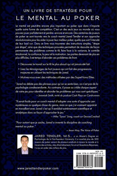 Le mental est peut-être encore plus important au poker que dans n'importe quelle autre forme de compétition. C'est un des seuls jeux au monde où vous pouvez jouer parfaitement et perdre - encore et encore. Des centaines de joueurs de poker se sont tournés vers le coach mental Jared Tendler et son approche révolutionnaire pour les aider à jouer leur meilleur poker, quelle que soit l'intensité de leur bad run. Dans ce livre vous trouverez des instructions simples, "étape par étape", ainsi que des techniques prouvées permettant de résoudre de façon permanente des problèmes comme le tilt, faire face à la variance, le contrôle émotionnel, la confiance, la peur et la motivation. Les parties devenant de plus en plus difficiles, il est temps d'aborder ces problèmes de front. Découvrez le travail sur le tilt le plus abouti qui ait jamais été fait. Lisez les témoignages de huit joueurs qui ont fait des progressions majeures en utilisant les techniques de Jared. Motivez-vous avec des méthodes utilisées par des SuperNova Elites.