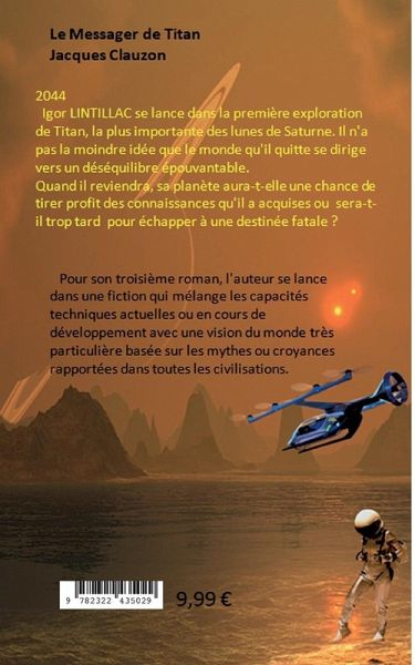 2044Igor LINTILLAC se lance dans la première exploration de Titan, la plus importante des lunes de Saturne. Il n'a pas la moindre idée que le monde qu'il quitte se dirige vers un déséquilibre épouvantable. Quand il reviendra, sa planète aura-t-elle une chance de tirer profit des connaissances qu'il a acquises ou sera-t-il trop tard pour échapper à une destinée fatale ?