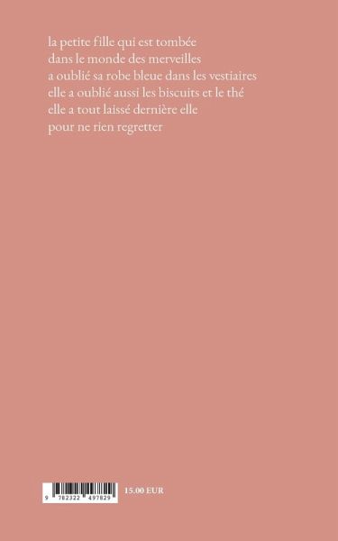 la petite fille qui est tombée dans le monde des merveilles a oublié sa robe bleue dans les vestiaires elle a oublié aussi les biscuits et le thé elle a tout laissé dernière elle pour ne rien regretter ce recueil de poésie contemporaine est découpé en 3 parties : miel épines roses