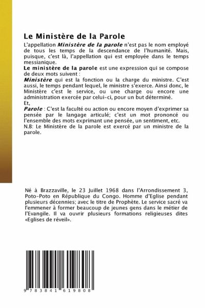 L'appellation Ministère de la parole n'est pas le nom employé de tous les temps de la descendance de l'humanité. Mais, puisque, c'est là, l'appellation qui est employée dans le temps messianique.Le ministère de la parole est une expression qui se compose de deux mots suivent :Ministère qui est la fonction ou la charge du ministre. C'est aussi, le temps pendant lequel, le ministre s'exerce. Ainsi donc, le Ministère c'est le service, ou une charge ou encore une administration exercée par celui-ci, pour un but déterminé.Et,Parole : C'est la faculté ou action ou encore moyen d'exprimer sa pensée par le langage articulé; c'est un mot prononcé ou l'ensemble des mots exprimant une pensée, un sentiment, etc.N.B: Le Ministère de la parole est exercé par un ministre de la parole.