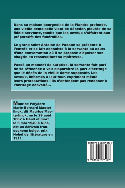 Dans sa maison bourgeoise de la Flandre profonde, une vieille demoiselle vient de décéder, pleurée de sa fidèle servante, tandis que les neveux s'affairent aux préparatifs des funérailles. Le grand saint Antoine de Padoue se présente à l'entrée et se fait connaître à la servante au cours d'une conversation où il se propose d'apaiser son chagrin en ressuscitant sa maîtresse. Passé un moment de surprise, la servante fait part de sa réticence à voir disparaître la part d'héritage que le décès de la vieille dame supposait. Les neveux, informés à leur tour, expriment même leurs protestations : ils n'entendent pas renoncer à l'héritage convoité...