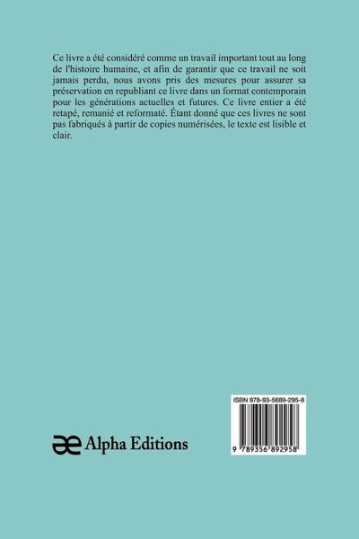 Le ménagier de Paris (v. 1 & 2), a été reconnu comme une uvre majeure dans toute l'histoire humaine, et nous avons pris des précautions pour assurer sa préservation en rééditant ce livre de manière moderne pour les générations présentes et futures. Ce livre a été entièrement retapé, révisé et reformaté. Le texte est lisible et clair car ces livres ne sont pas créés à partir de copies numérisées.