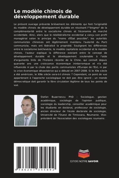 Le présent ouvrage présente brièvement les éléments qui font l'originalité du modèle chinois de développement durable en résolvant l'"énigme" de la complémentarité entre le socialisme chinois et l'économie de marché occidentale. Ainsi, alors que le néolibéralisme occidental a conçu son profil managérial selon le principe du "moins d'État possible", les autorités communistes chinoises ont légitimement maintenu l'autorité du Parti communiste, mais ont libéralisé la propriété. Soulignant les différences entre le socialisme bolcheviste, le modèle capitaliste occidental et le modèle chinois, l'auteur explique la différence existant entre le concept de développement durable et le développement soutenable à l'aide d'arguments tirés de l'histoire récente de la Chine, qui connaît depuis quarante ans une croissance économique ininterrompue et n'a été influencée ni par la chute des partis communistes d'Europe de l'Est, ni par la crise économique dévastatrice qui a débuté en 2007-2008. Si le XXe siècle a été américain, le XXIe siècle sera-t-il chinois ? Cependant, ce point de vue appartenant à l'approche sociologique ne doit pas être ignoré ; un monde démocratique doit garantir la libre circulation légitime de tous les points de vue.