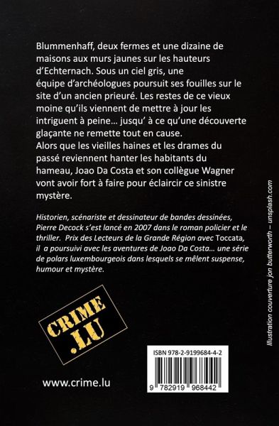 Blummenhaff, deux fermes et une dizaine de maisons aux murs jaunes sur les hauteurs d'Echternach. Sous un ciel gris, une équipe d'archéologues poursuit ses fouilles sur le site d'un ancien prieuré. Les restes de ce vieux moine qu'ils viennent de mettre à jour les intriguent à peine... jusqu' à ce qu'une découverte glaçante ne remette tout en cause. Alors que les vieilles haines et les drames du passé reviennent hanter les habitants du hameau, Joao Da Costa et son collègue Wagner vont avoir fort à faire pour éclaircir ce sinistre mystère.