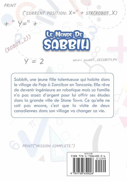 ¿Découvrez l'histoire inspirante de Sabbih, une jeune fille déterminée d'un petit village en Tanzanie qui défie toutes les chances pour poursuivre son rêve de devenir ingénieur en robotique.¿ Rencontrez Sabbih, une fille brillante et ambitieuse du petit village de Paje à Zanzibar, en Tanzanie, qui rêve d'aller dans la prestigieuse école STEM de Stone Town. Avec une passion pour la robotique, elle travaille sans relâche pour étudier et réussir ses examens. Malgré les obstacles financiers, sa famille se rassemble autour d'elle, l'encourageant à chaque étape. Basé sur une histoire vraie, Le Monde De Sabbih© suit le parcours de Sabbih alors qu'elle surmonte les obstacles pour poursuivre ses rêves et nous montre comment un simple acte de gentillesse peut faire toute la différence dans la vie de quelqu'un. ¿¿Visitez www.tnse.tech pour accéder aux ressources téléchargeables accompagnant le livre.