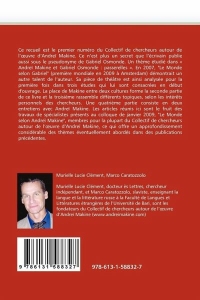 Ce recueil est le premier numéro du Collectif de chercheurs autour de l' uvre d'Andreï Makine. Ce n'est plus un secret que l'écrivain publie aussi sous le pseudonyme de Gabriel Osmonde. Un thème étudié dans " Andreï Makine et Gabriel Osmonde : passerelles ". En 2007, "Le Monde selon Gabriel" (première mondiale en 2009 à Amsterdam) démontrait un autre talent de l'auteur. Sa pièce de théâtre est ainsi analysée pour la première fois dans trois études qui lui sont consacrées en début d'ouvrage. La place de Makine entre deux cultures forme la seconde partie de ce livre et la troisième rassemble différents topiques, selon les intérêts personnels des chercheurs. Une quatrième partie consiste en deux entretiens avec Andreï Makine. Les articles réunis ici sont le fruit des travaux de spécialistes présents au colloque de janvier 2009, "Le Monde selon Andreï Makine", membres pour la plupart du Collectif de chercheurs autour de l' uvre d'Andreï Makine, ce qui offre un approfondissement considérable des thèmes éventuellement abordés dans des publications précédentes.