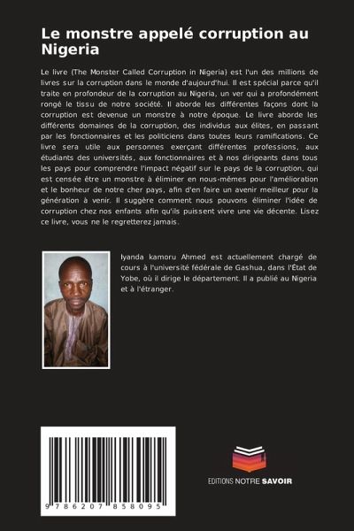 Le livre (The Monster Called Corruption in Nigeria) est l'un des millions de livres sur la corruption dans le monde d'aujourd'hui. Il est spécial parce qu'il traite en profondeur de la corruption au Nigeria, un ver qui a profondément rongé le tissu de notre société. Il aborde les différentes façons dont la corruption est devenue un monstre à notre époque. Le livre aborde les différents domaines de la corruption, des individus aux élites, en passant par les fonctionnaires et les politiciens dans toutes leurs ramifications. Ce livre sera utile aux personnes exerçant différentes professions, aux étudiants des universités, aux fonctionnaires et à nos dirigeants dans tous les pays pour comprendre l'impact négatif sur le pays de la corruption, qui est censée être un monstre à éliminer en nous-mêmes pour l'amélioration et le bonheur de notre cher pays, afin d'en faire un avenir meilleur pour la génération à venir. Il suggère comment nous pouvons éliminer l'idée de corruption chez nos enfants afin qu'ils puissent vivre une vie décente. Lisez ce livre, vous ne le regretterez jamais.