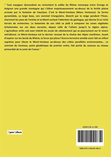Le Mont-Ventoux, situé entre Orange et Avignon, est une montagne emblématique de la Provence, reconnue pour sa forme pyramidale et son sommet enneigé. Cette étude, menée par Charles Martins, explore les caractéristiques géologiques et botaniques de cette montagne. Le Mont-Ventoux est un point d'intérêt pour les géologues en raison de sa structure complexe, résultant de forces tectoniques qui ont soulevé ses couches calcaires. Les botanistes y trouvent également un terrain d'étude idéal, avec des zones végétales distinctes allant des oliviers à la flore alpine. Le mistral, vent violent de la…mehr