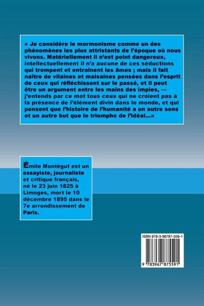 Je considère le mormonisme comme un des phénomènes les plus attristants de l'époque où nous vivons. Matériellement il n'est point dangereux, intellectuellement il n'a aucune de ces séductions qui trompent et entraînent les âmes ; mais il fait naître de vilaines et malsaines pensées dans l'esprit de ceux qui réfléchissent sur le passé, et il peut être un argument entre les mains des impies, - j'entends par ce mot tous ceux qui ne croient pas à la présence de l'élément divin dans le monde, et qui pensent que l'histoire de l'humanité a un autre sens et un autre but que le triomphe de l'idéal...